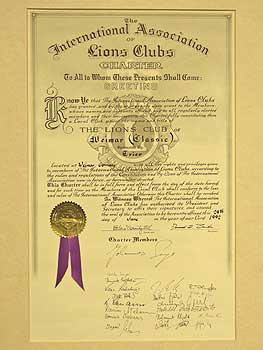 An Goethes 243. Geburtstag, dem 28. 8. 1992 konnte im Beisein vieler Gäste und Freunde im Deutschen Nationaltheater die Feier der offiziellen Beurkundung (Charterfeier) stattfinden. 28 Mitglieder trugen sich in die Gründungsurkunde ein. Die Patenschaft übernahm der LIONS-Club Trier. Mitglied in einem LIONS-Club zu sein ist nicht nur verpflichtend sondern auch schön. Gemeinschaft, Geselligkeit, Freundschaft und Kooperation prägen das innere Leben in einem Club.